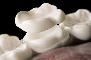 Restoration that is made in a dental lab and then bonded into the area of a tooth between cusps. Larger and stronger than a filling, yet not as significant as a crown.