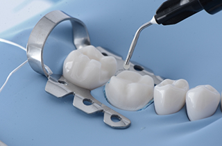 Portion of a tooth that extends above the gum line. Also refers to a lab-made restoration known as a cap or the tooth placed on a dental implant.